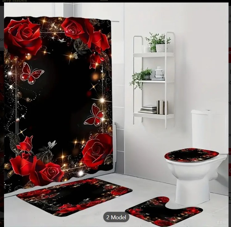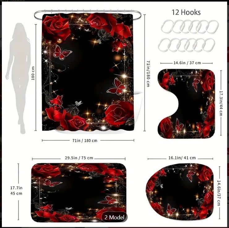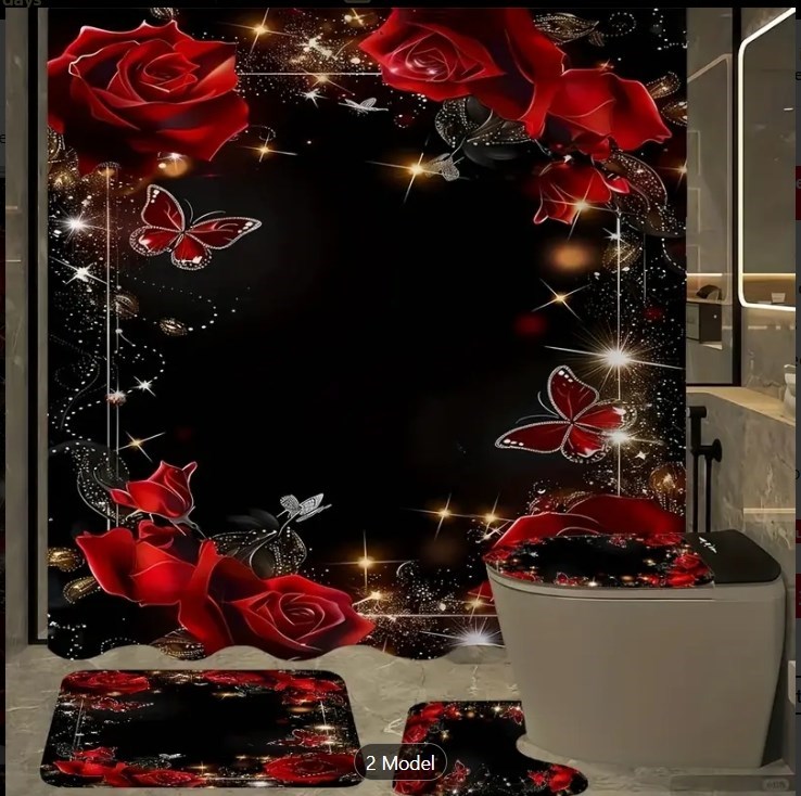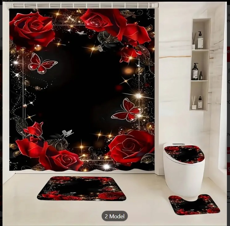 1/4pcs Rose Butterfly, Shower Curtain Set, with 12 Hook Shower Curtain, Non Slip Floor Mat, Toilet U-shaped Pad, Toilet Lid Pad, Bathroom Sets Full Set, Bedroom Decoration, Home Decoration, Bathroom Decoration And Accessories, Valentine's Day Gift